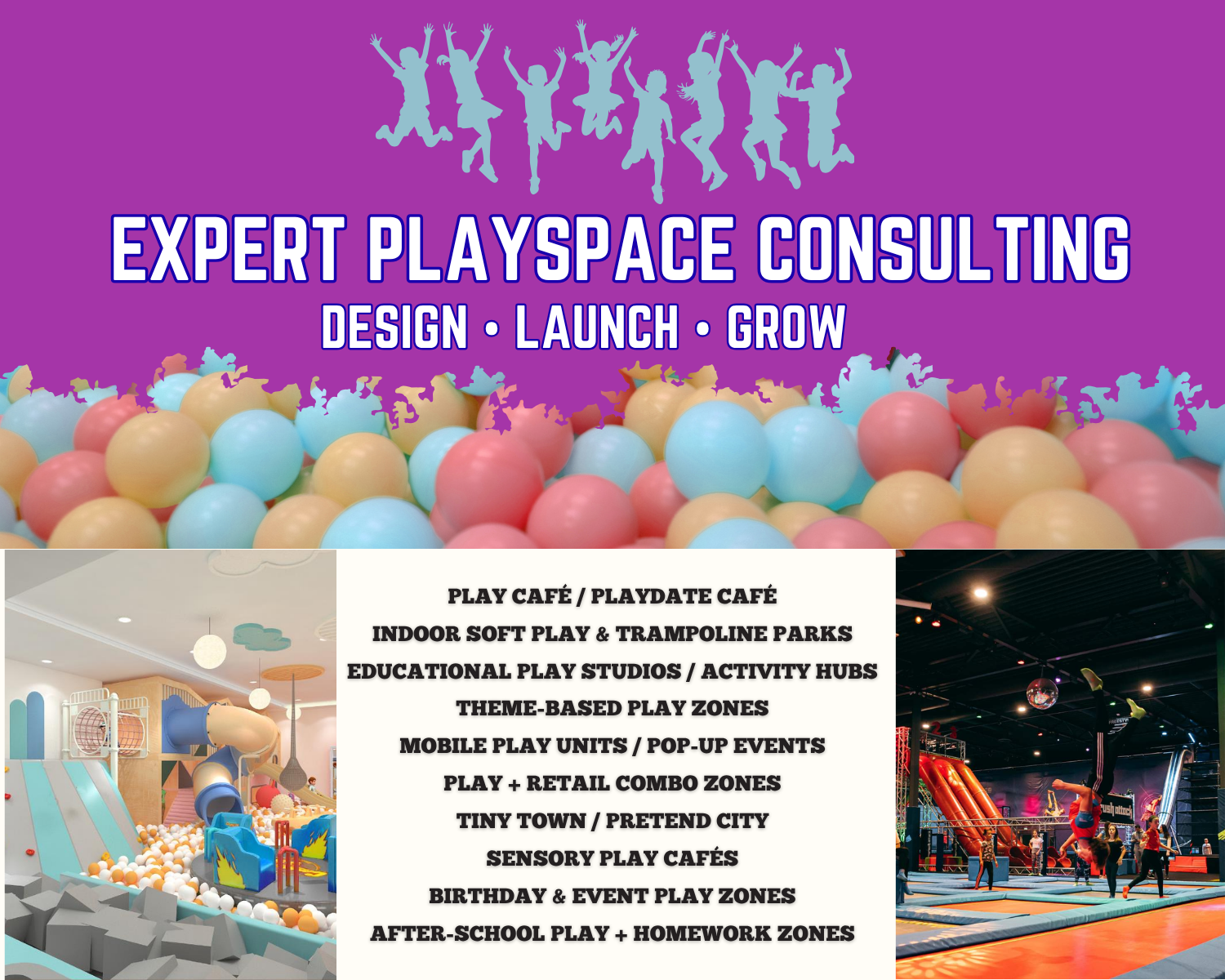 Comprehensive design, launch, and growth services for play cafes, indoor soft play, trampoline parks, educational play studios, and more.